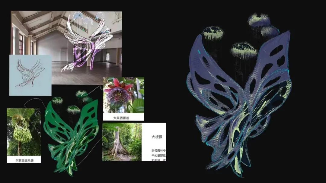 灵感来源于参考巨魔芋,金杯藤,何其美鹿角蕨这三种植物,借鉴他们的颜色,形态,特点,综合生成。