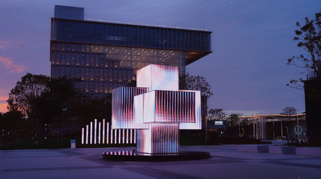“智慧灯杆”基于“滴水湖”的实现海浪数据,经由算法生成高低起伏的轮廓形状,再转化为几何形状的LED矩阵,形成一片数字的“海浪矩阵”。